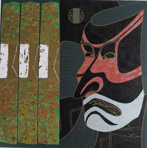 estampas de tecidos japoneses colados sobre as telas. Nessas obras, feitas de